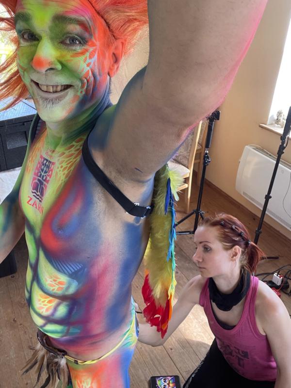 Unsere preisgekrönte Painter*innen-Crew – ausgezeichnet bei internationalen Weltmeisterschaften – verwandelt einen unserer Comedy-Aliens live vor Ihren Augen in ein exotisches, schillerndes Wesen aus einer anderen Galaxie.